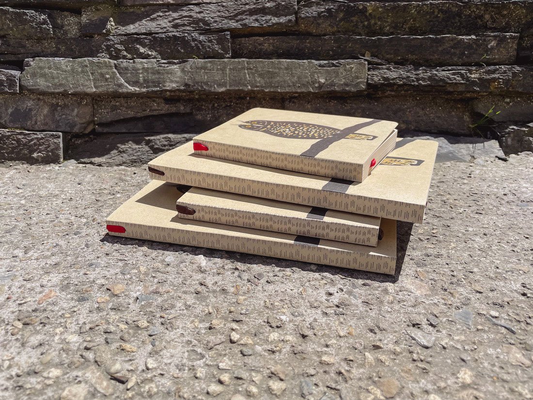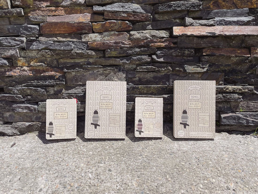 Cuadernos papel 90grm., 0% químicos, 100% caña, 192 pág., color crema clarito natural del papel. Opción con el papel interno en blanco o con punticos. Encuadernación rústica (portada semi dura), cosida con hilo y al final una técnica a mano que es muy buena para que sean muy requete muy cómodas para dibujar y escribir.