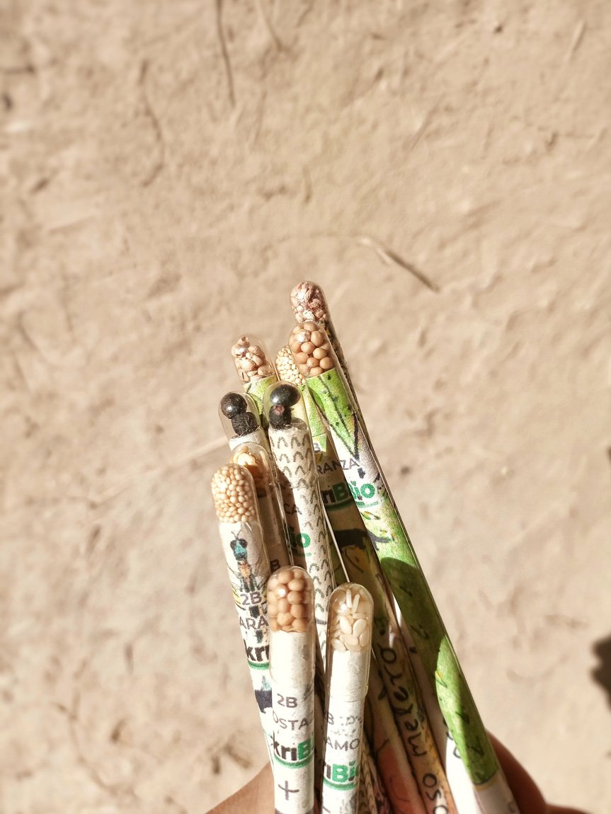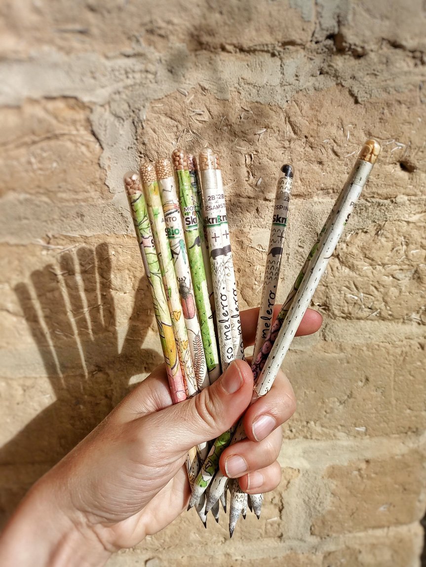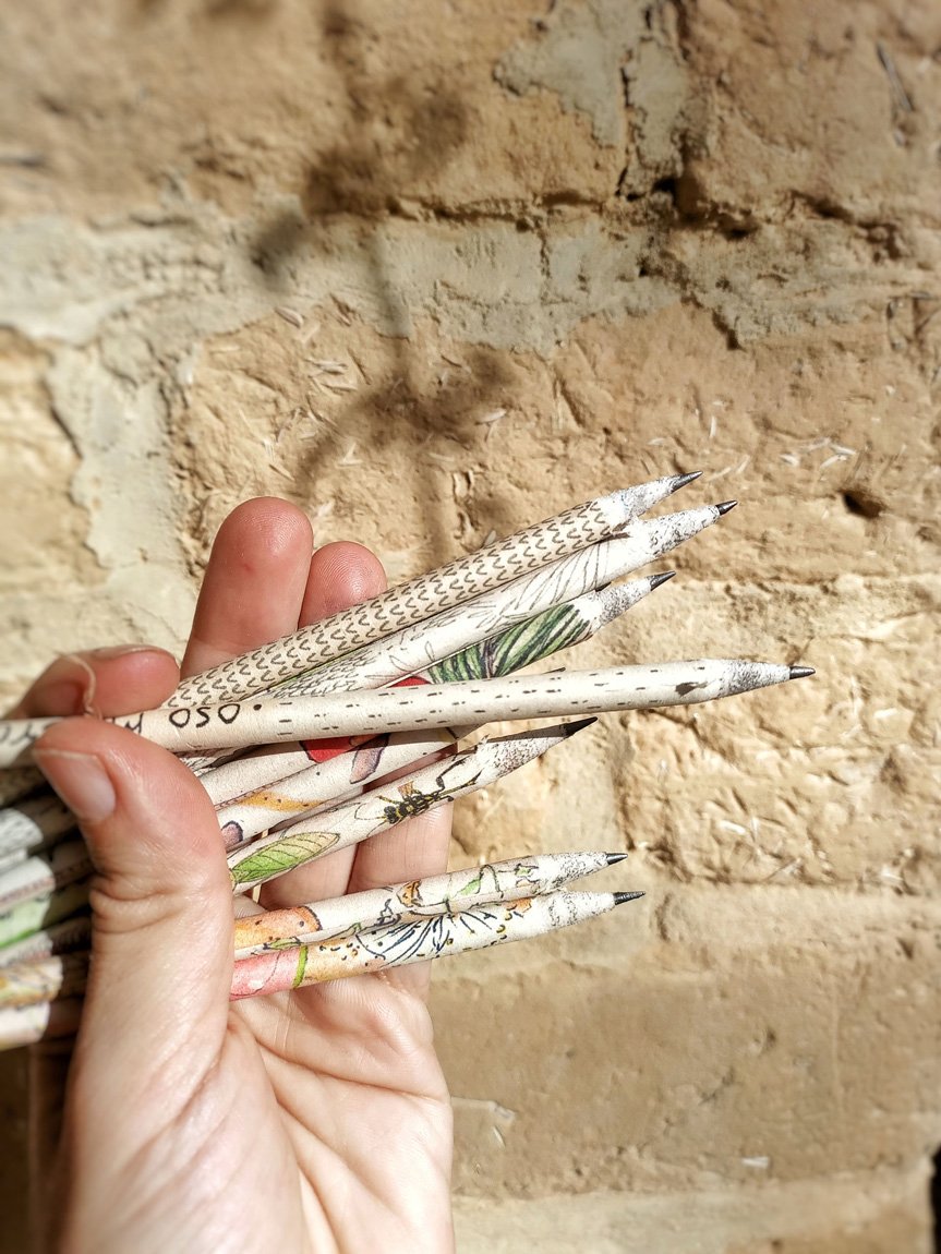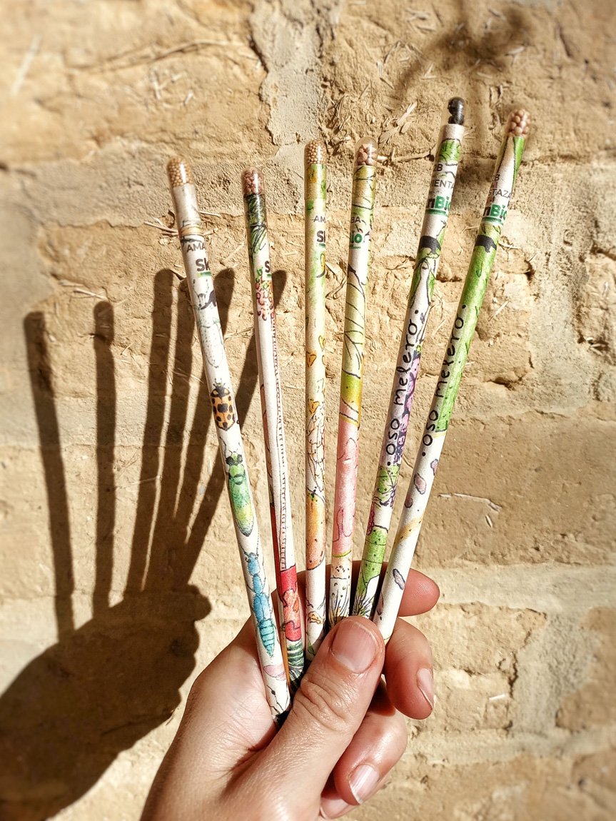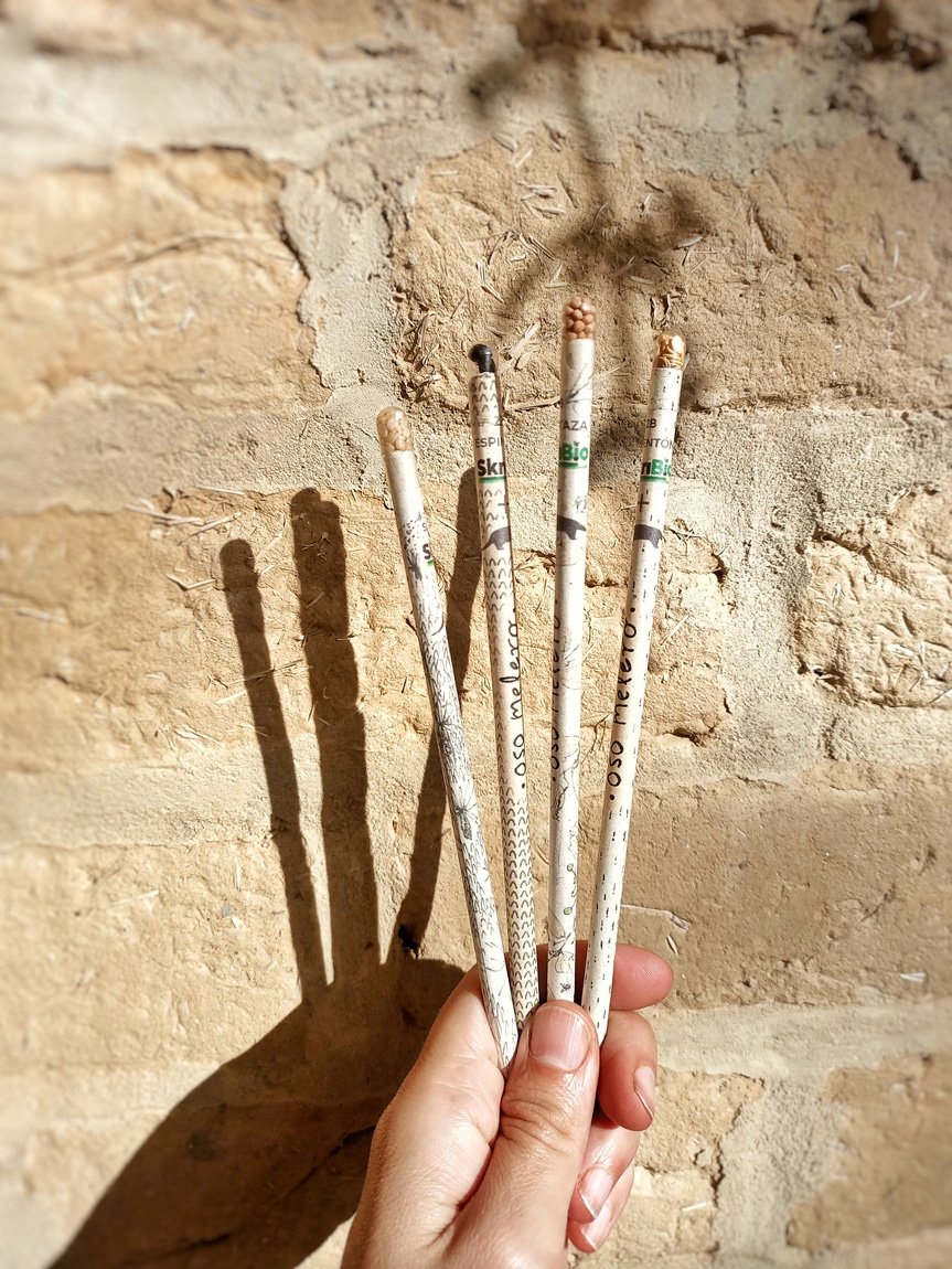 Lápices de papel reciclado (para no usar madera) y semillas orgánicas en la punta listicas para sembrar.